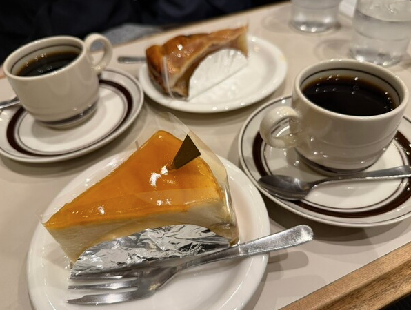 地下に広がる200席もの広い空間は、赤い階段やシャンデリアが印象的で、昭和レトロな雰囲気と優雅さが味わえます。店内ではクラシック音楽が流れ、都会の喧騒から離れてゆったりとコーヒーや軽食を楽しめるのが魅力です。ドラマのロケ地になったこともあります🎻