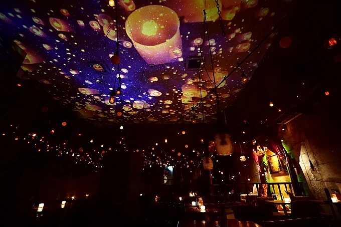 一見普通のアンティークカフェですが、ディナーの時間になると4K解像度の全面プラネタリウムに切り替わり幻想的な空間に大変身します✨