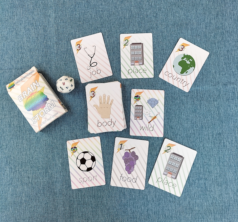 ・ひとり1枚ずつカードを引きサイコロを振ります。カードのカテゴリーに当てはまり、サイコロで出たアルファベットから始まる単語を言えたらそのカードをもらえます。例えば、カテゴリーがactionでサイコロでアルファベットがCが出ました。この場合、callやcutなどCから始まる動詞が言えればOKです。カードにはそれぞれ点数の数字が書いてあります。ゲームの最後に、獲得したカードの合計点を競います。