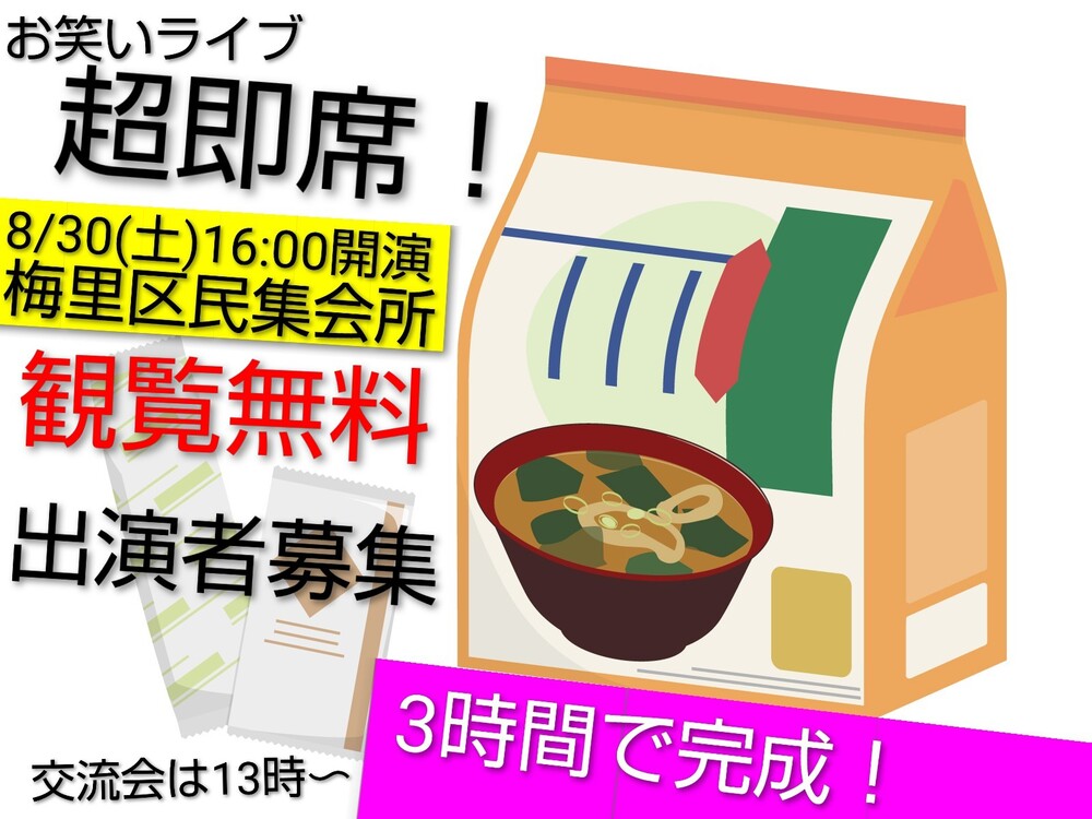 参加者が交流会で集まりその参加者のみで16時からのお笑いライブに即席ペアで出演するお笑いイベントです。