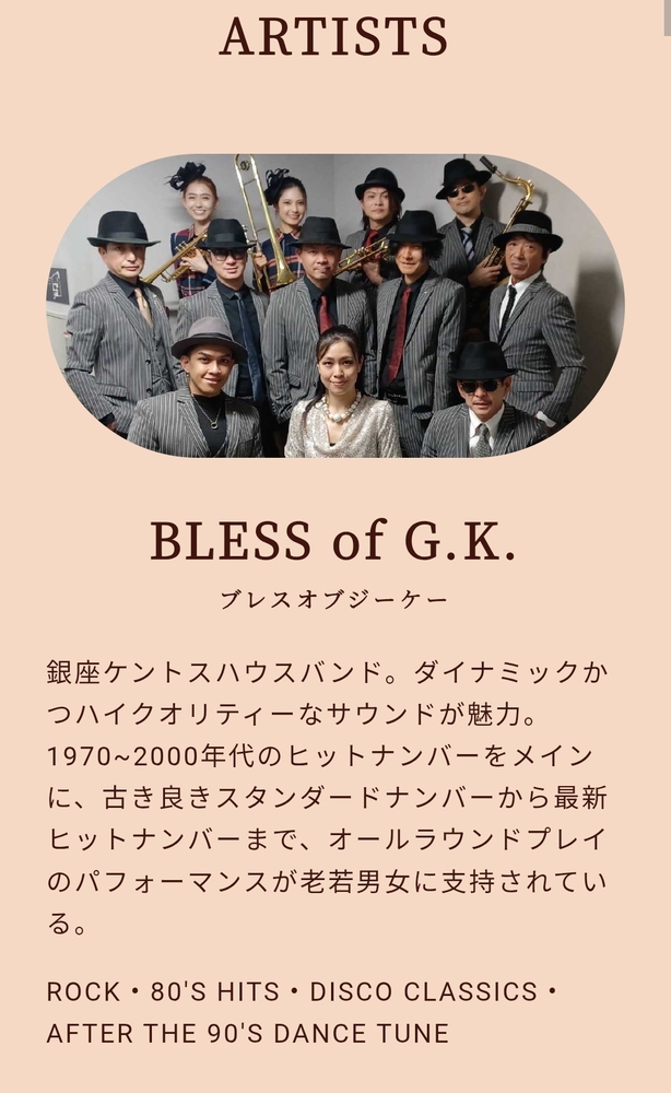 ウィルソンピケット、ジェームスブラウン、サムクック、オーティスレディングetcの最高にファンキーなR&B。アースウィンド&ファイアー、シック、ドナサマーetcの一寸小粋なDISCO CLASSICS。ディープパープル、クイーン、ステッペンウルフetcのワイルドでエキサイティングな70'SROCK。ブレスオブG.K.はR&B・モータウン・ディスコクラシックスを中心に、お馴染みのR&Rや往年の70'SROCKなどを、4人のホーンセクション(ブレスメーカー)を従えた大迫力のサウンドでお届けします。
