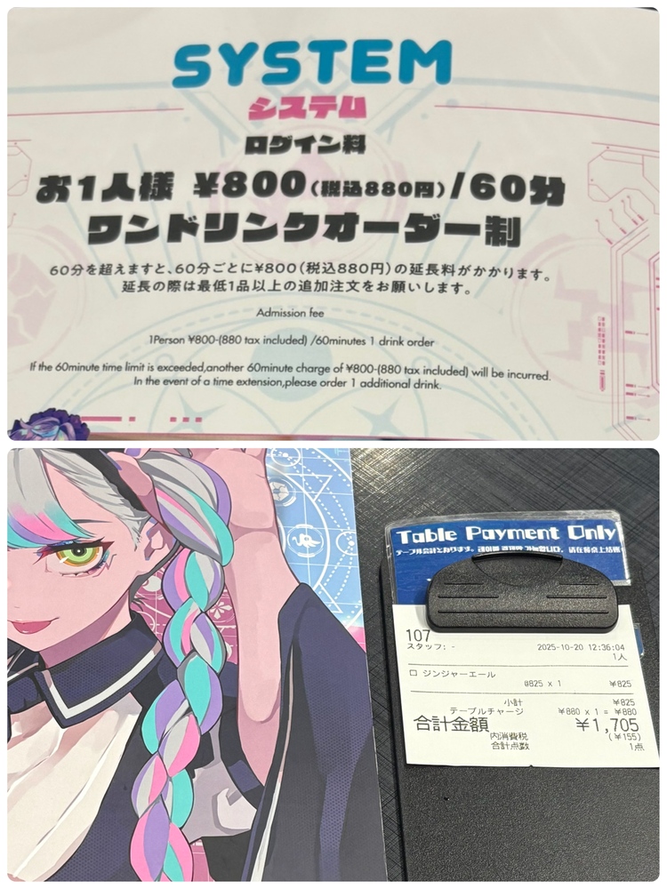 1時間滞在、ソフトドリンク飲んで1705円(税込)でした