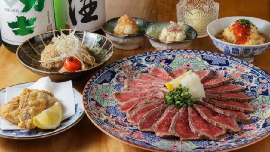 【2時間飲み放題付き◆4,000円コース】和牛ザブトンのたたき・つみれ煮込みなどの創作料理7品を、生ビール、ホッピー、ハイボール、サワー、焼酎、日本酒を含む種類豊富なドリンクと共に堪能♪