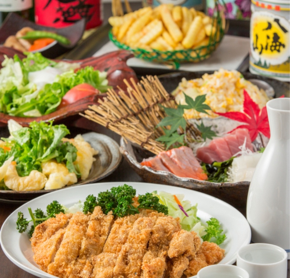 ◆揚げ物 ジューシーな若鶏唐揚げの盛皿 または 夢吉自家製台湾風悪魔鳥カツ