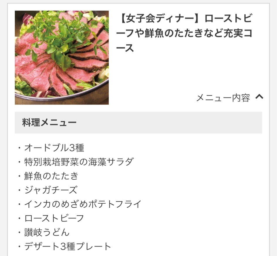 女子会ディナーローストビーフや鮮魚のたたきなど充実コース