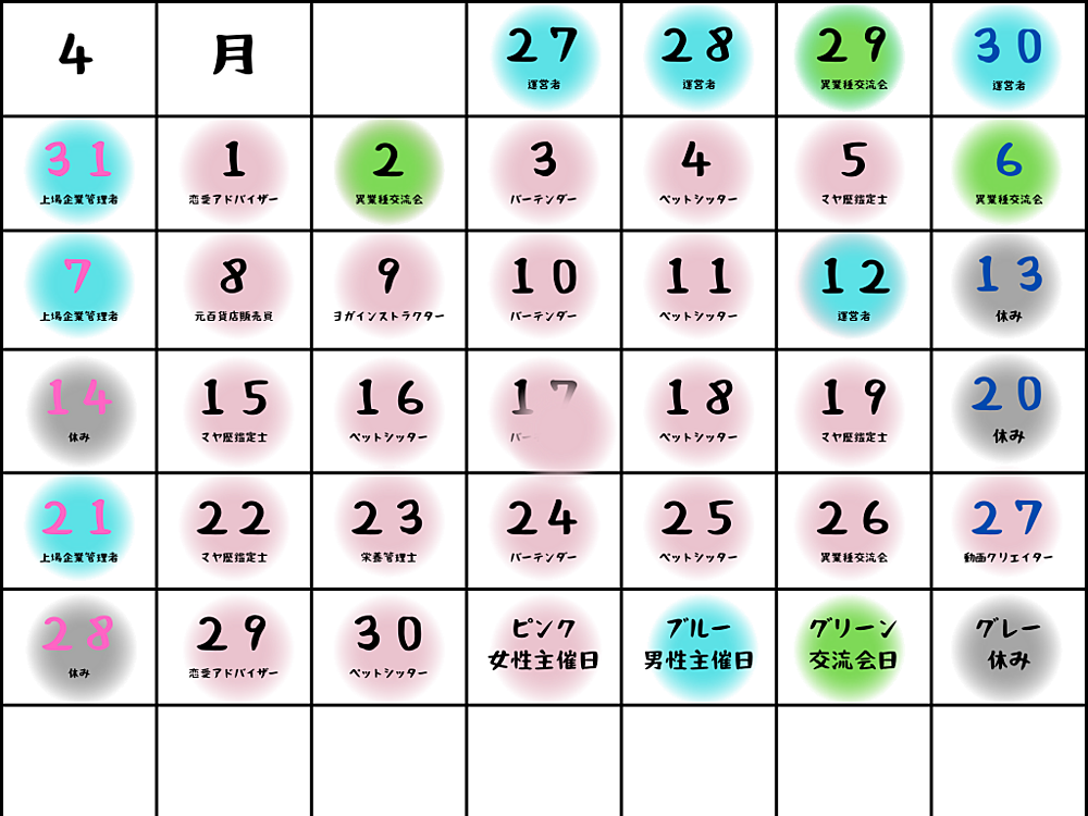 ペットシッター マジシャン マヤ歴鑑定士 舞台女優 タレント アイドル バーテンダー ボディスタイリスト 薬剤師 栄養管理士 動画クリエイター 元エンジニア 恋愛アドバイザー 耳つぼマッサージ ヨガインストラクター 元百貨店販売員