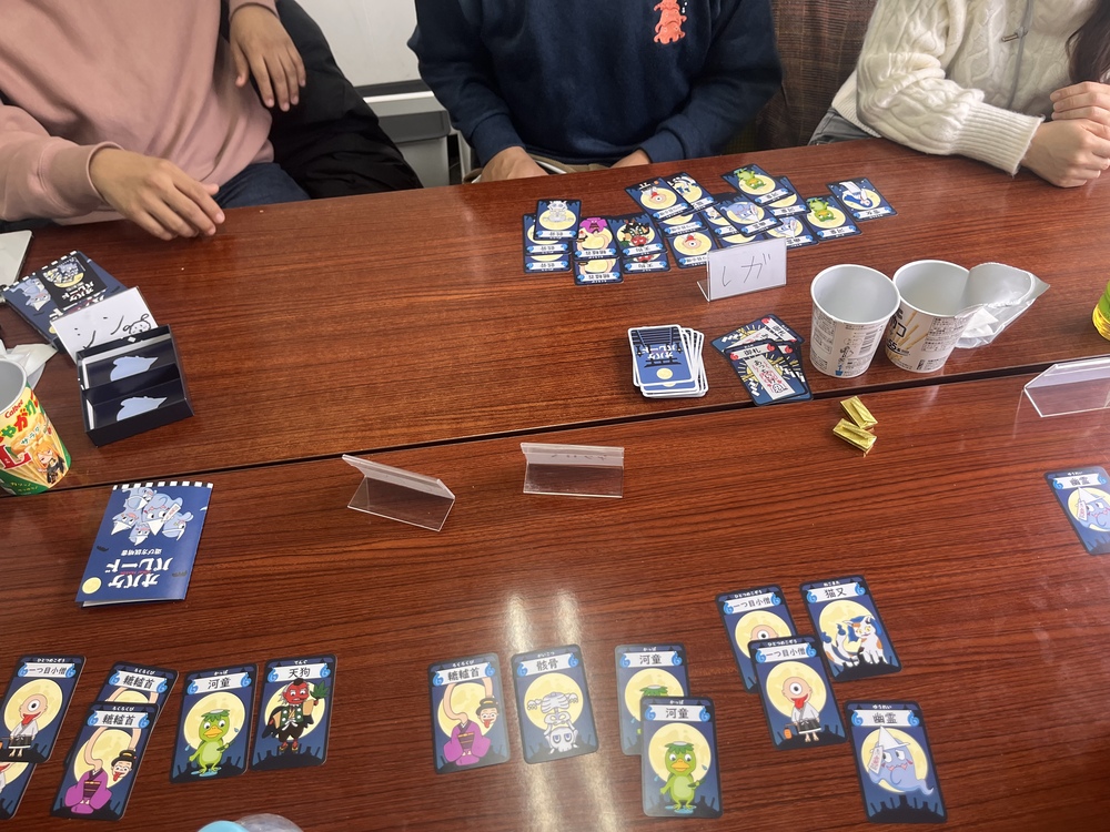 ボードゲームのタイトル例:ito、ボブジテン、音速飯店、もっとホイップを、コードネーム、ゲスクラブ、ゴキブリポーカー、タイムボム、コヨーテ、犯人は踊る、あいうえバトル、ゲシェンク、ナナドリドリ、シンソクキネマ、ニムト、狩歌、クイズいいセン行きまSHOW、スカル、アヴァロン、四季折折、スカルキング、ポイントサラダ、ウントチュースその他多数。