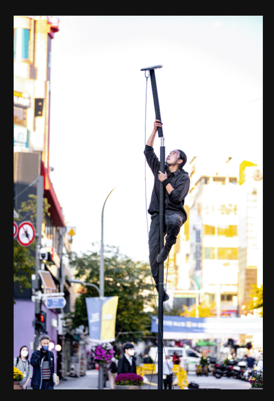 《ポロシウム》はポールとコロシウムを組み合わせた造語で、観客参加型サーカスパフォーマンスです。ポールを立てるというシンプルな目的を達成するため、パフォーマーも観客も一連のプロセスを経験することで、その間の境界は崩れていきます。《ポロシウム》は観客とともに作り上げていくものであり、その過程で起こる人間関係や協力、そして苦闘や失敗の瞬間など、そのプロセスそのものが重要です。それはまさに、人生の縮図です。
