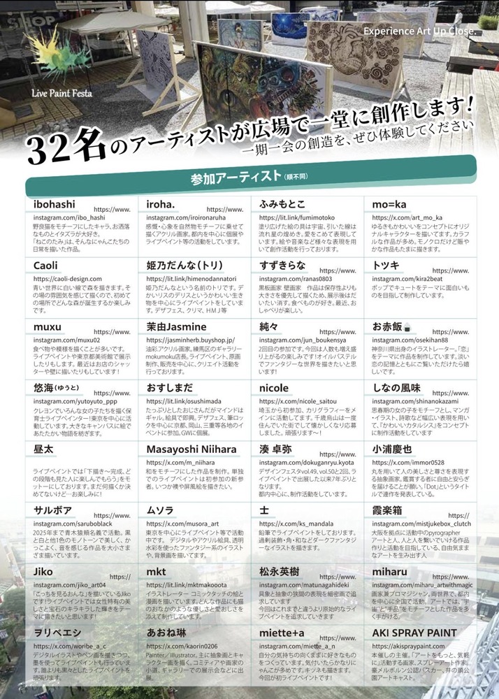 • 13:15 ライブペイントフェスタ鑑賞(屋外で32名のパフォーマンスを堪能!)