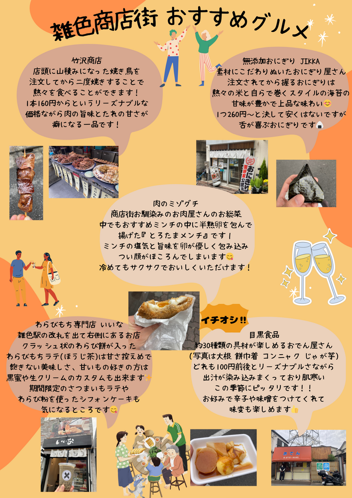 そんな雑色商店街では熱々出来立てが食べられる焼き鳥やおにぎり、優しい味のおでんなどボリューム満載のラインナップになっております😊
