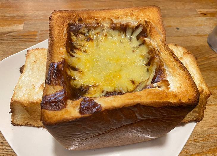 大きな食パンをくり抜いて作るグラパンは、デミグラスやエビのミックスホワイトソースなどから選べ、中身をたっぷり染み込ませて食べる贅沢な一品です🍭🍭