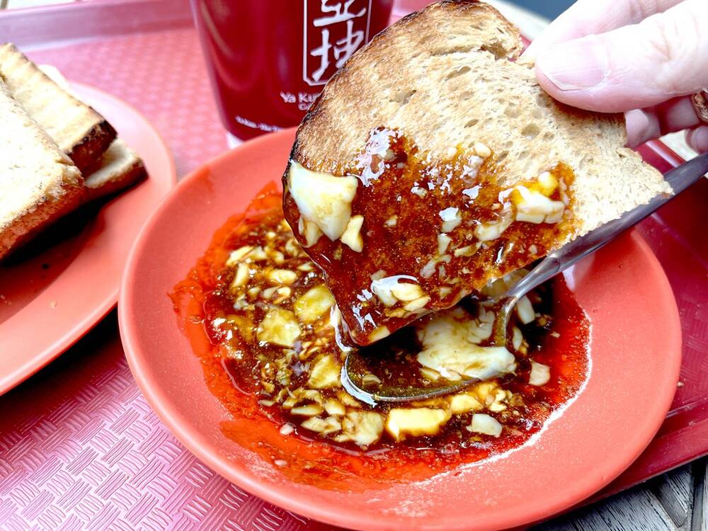 馴染みがない「カヤジャム」は、砂糖、卵、ココナッツミルク、パンダンリーフから作られていて、程よく甘く、パンに合います⭐⭐