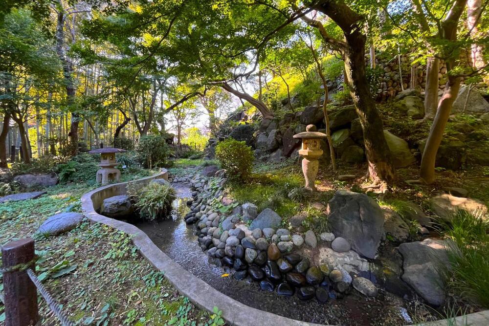 「等々力渓谷」は東京23区内唯一の渓谷。鬱蒼とした武蔵野台地の自然の姿を残し、『等々力不動尊』(明王寺)の境内を含むその一帯が東京都指定文化財(東京都指定名勝)。その一部が世田谷区立の都市公園『等々力渓谷公園』となっており、園内南部には昭和の東京を代表する造園家の一人・飯田十基が作庭した日本庭園があります。