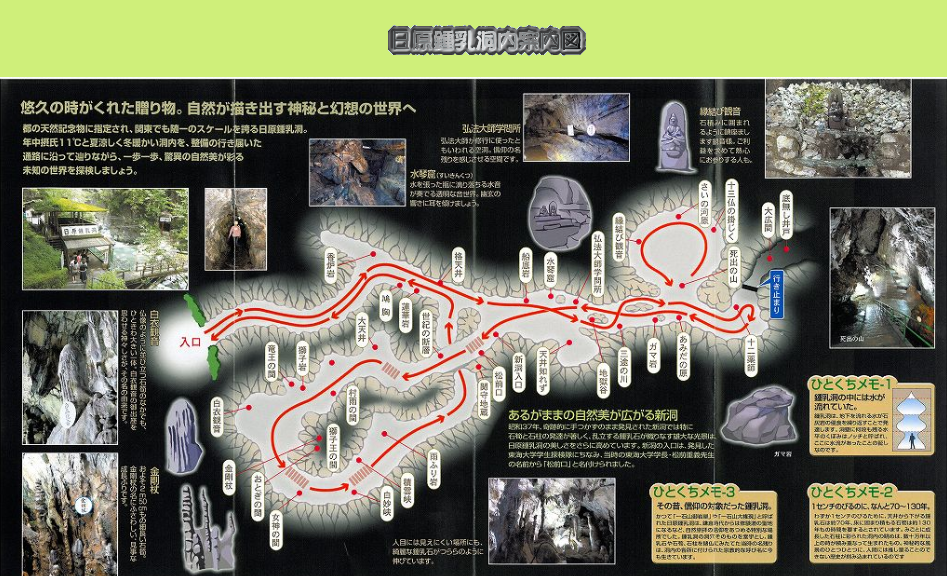 「日本鍾乳洞九選」にも選ばれ、総延長は1,270m、高低差134mにおよび、探索時間が約40分と関東随一といわれる規模です。