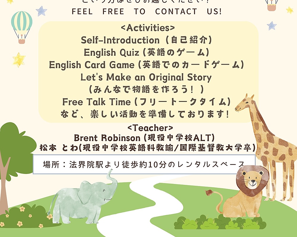 今回の英会話イベントは現役中学校ALTのとっても優しいカナダ人講師と、いつも元気!笑顔😊の現役中学校英語科教員のコラボレーションで行います!なので、初心者の方でも全く心配なく参加できますよ😌🔰