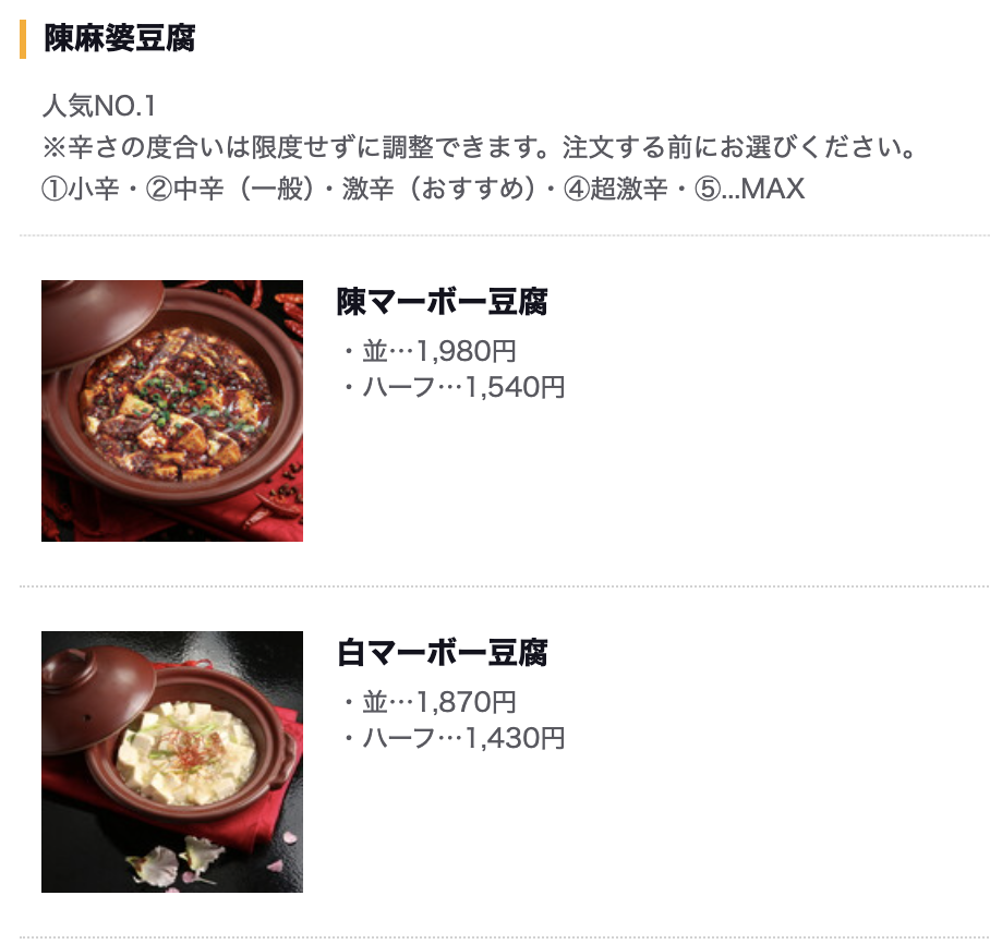 看板メニューの四川麻婆豆腐といえば「辛い=うまい」な感じですが、以下の通りに辛さは選べますのでご安心ください。