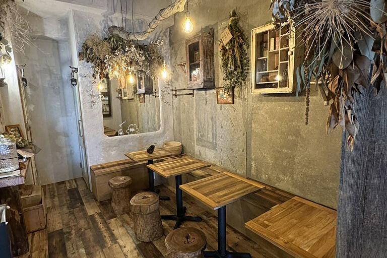 店内は木目調の家具にドライフラワーのアレンジメントで装飾。木の温もりを感じることがでる、まるで絵本の世界やジブリの森にいるような癒し空間となっています➰💕💕