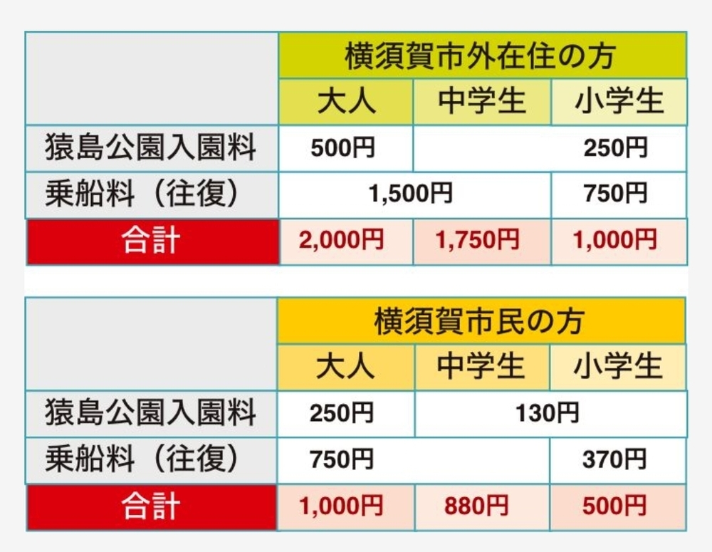 猿島公園入園料と乗船料往復で2000円。横須賀市民は1000円。デジタルチケットで買うと100円安くなります。