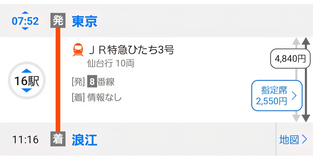 ※参考:東京駅〜浪江駅(特急ひたち号・指定席含む)の通常運賃は 7,390円 となります。