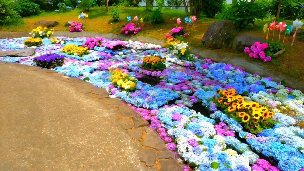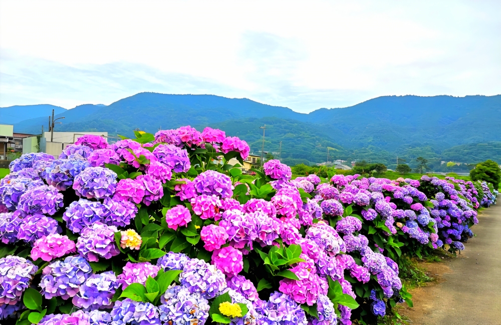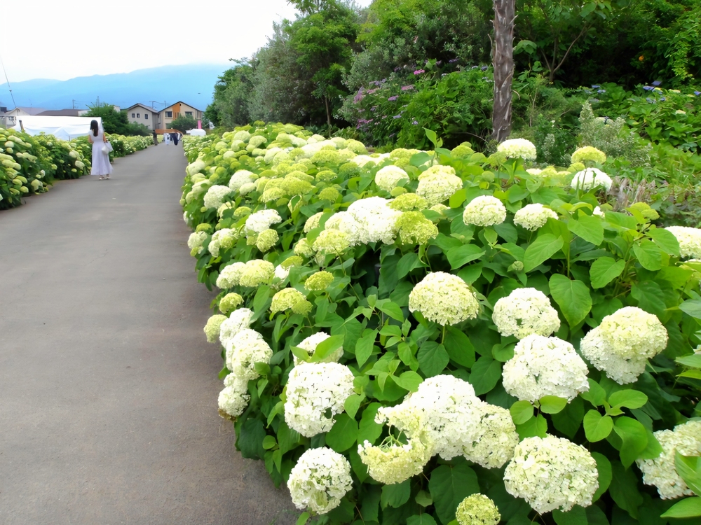 梅雨の晴れ間に、どこまでも続く田んぼのあぜ道と、色とりどりに咲き誇るあじさい。新松田駅から酒匂川を越え、水の流れる音に癒やされながら「あじさいの里」を目指します。