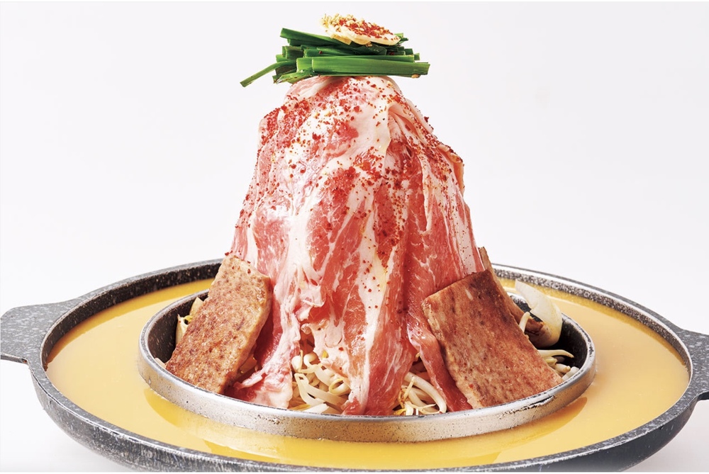 新鮮なお肉と野菜が山のように積み上げられた、圧巻のビジュアルを誇る旨辛鍋です。