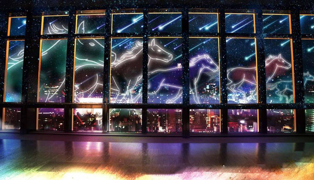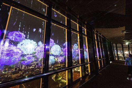 メインデッキからの美しい夜景を背景に、その窓面に優美かつ壮大に投映されるイメージは、室内に居ながらにして日本的な四季を感じさせます🐣🐣🐣